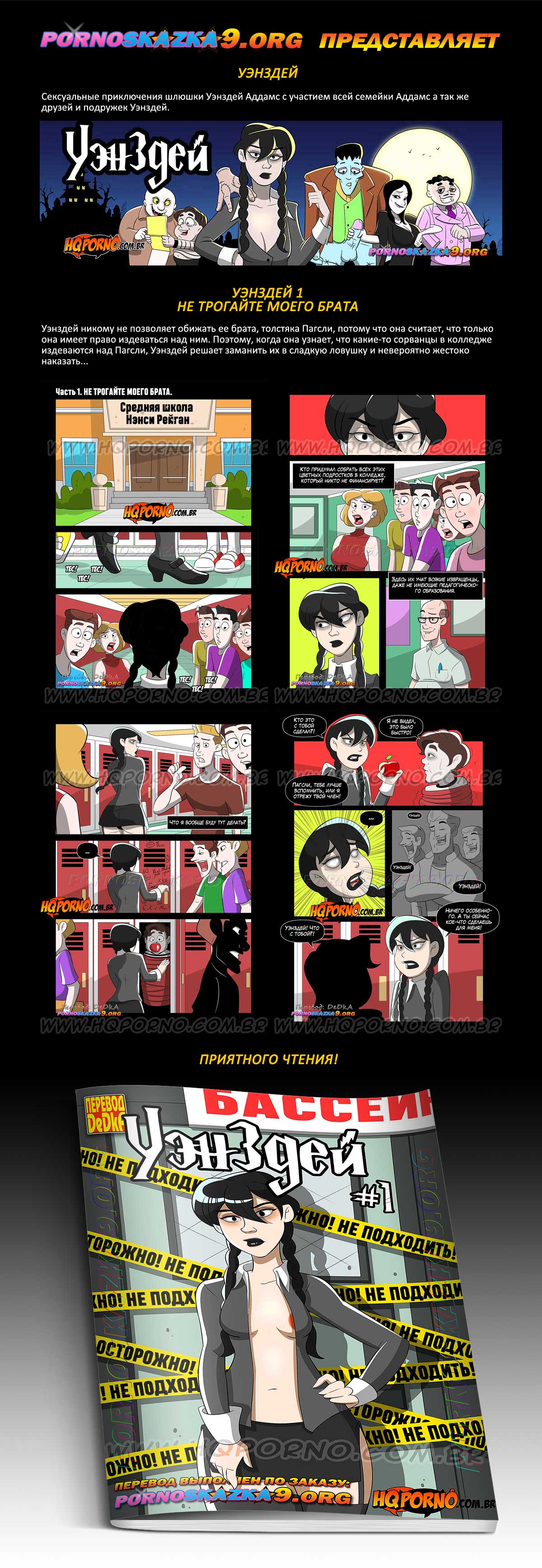 Порно комикс «Уэнздей. Часть 1. Не трогайте моего брата.» Уэнздей никому не позволяет обижать ее брата, толстяка Пагсли, потому что она считает, что только она имеет право издеваться над ним. Поэтому, когда она узнает, что какие-то сорванцы в колледже издеваются над Пагсли, Уэнздей решает заманить их в сладкую ловушку и невероятно жестоко наказать…